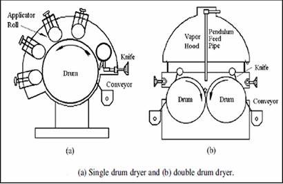 Drum dryer is a kind of rotating continuous drying equipment with internal heating function . Certain thickness of materials film attach to the drum from material liquid vessel under the drum. Heat is transferred to the internal wall of the cylinder through pipes and then to the external wall and to materials film, to evaporate the moisture in materials film so as to dry materials. Dried products are then scraped off by the blade fitted on the surface of the cylinder, fall down to the spiral conveyor under the blade, and are conveyed, collected and packed.