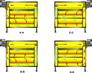 物料通过物料进料器均匀分布在网带上。 网带一般采用12-60目不锈钢网,由传动装置拉出,在干燥机内移动。 烘干机由几段组成。 对于每个部分,热空气分开循环。 一部分湿气通过特殊的排气鼓风机排出。 废气由调节阀控制。 热空气穿过网带带走水分。 网带运动缓慢,运行速度可根据材料性质自由调整。 干燥过程后的最终产品将不断落入材料收集器。 顶部和底部循环单元可根据用户要求自由装配。 可根据生产需要选择节数。热源也可以选择热泵加热。